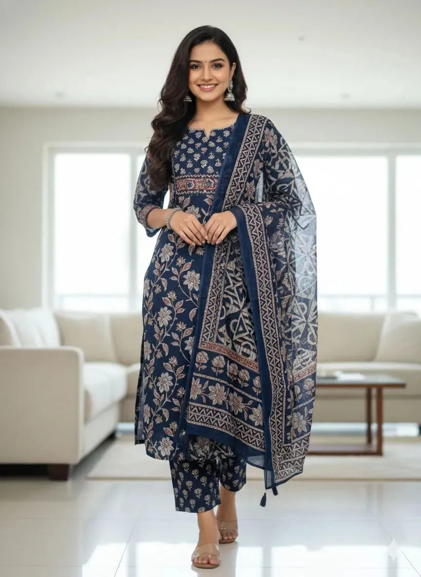 This blue pure cotton suit set is designed for comfort and elegance. The traditional prints make it a great option for office, home, and casual outings.